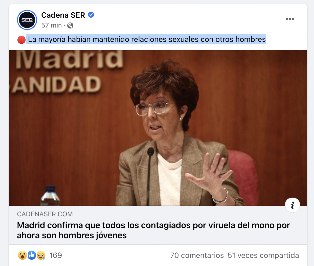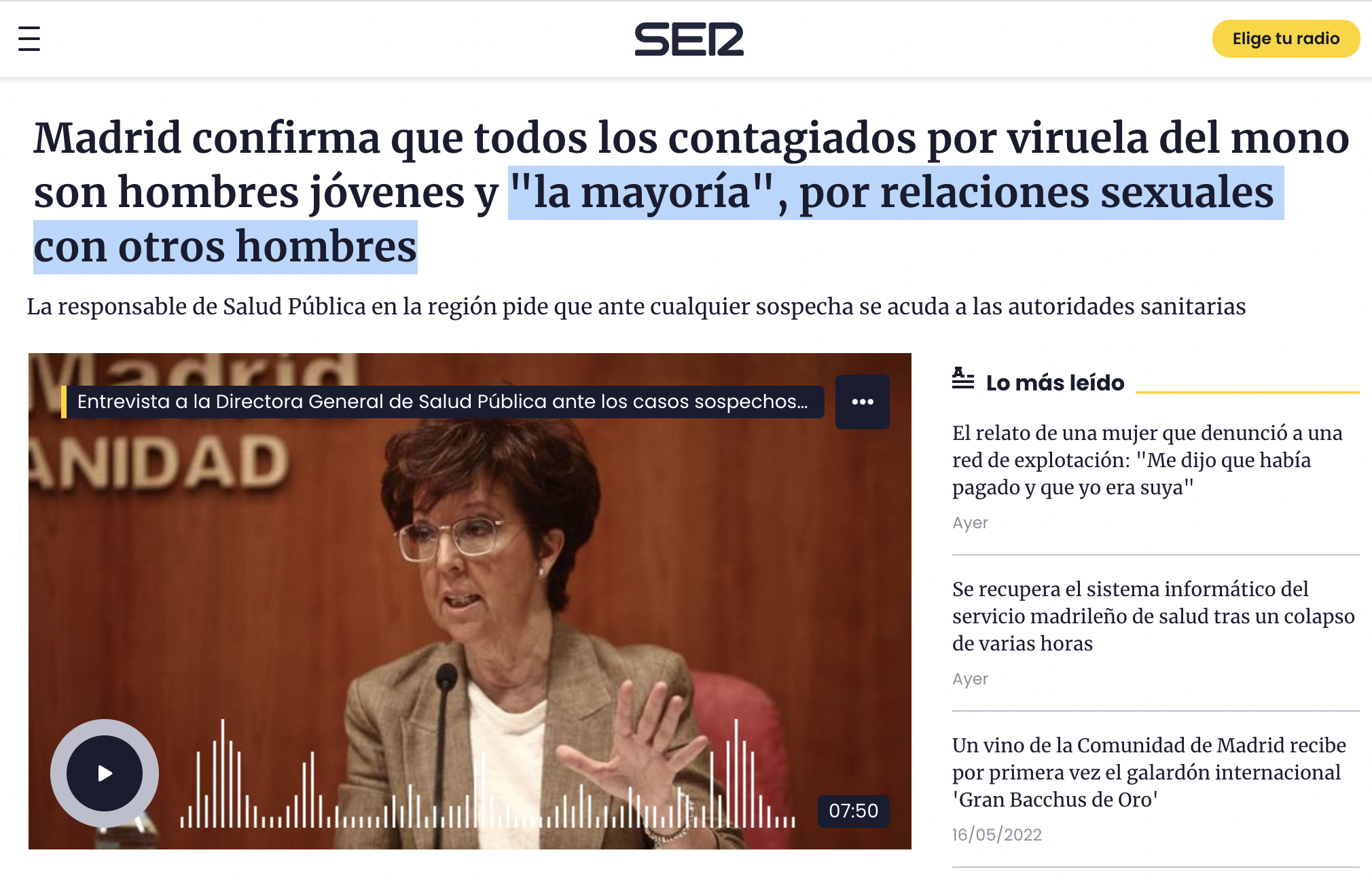 - Escuchar la entrevista de La Ser en la que Andradas confirma que los casos de viruela del mono corresponden a hombres jóvenes que han mantenido relaciones sexuales con otros hombres: