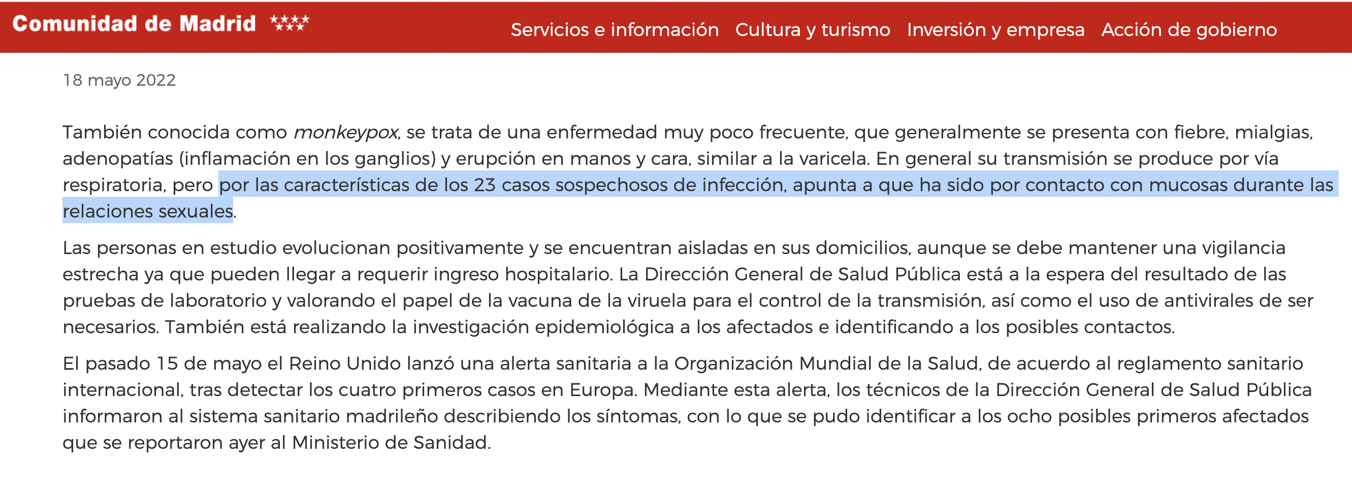 La Directora General de Salud Pública de la Comunidad de Madrid, Elena Andradas ha confirmado este miércoles 20 de mayo de 2022 que los 23 casos sospechosos -aún no confirmados- de infección por viruela del mono en la región son hombres jóvenes que han mantenido relaciones sexuales con otros hombres.