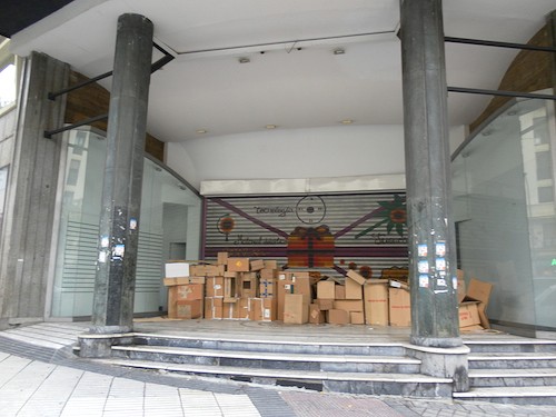 Eroski, el grupo propietario de esta cadena de librerías, cerraba el local tras un intento fallido de negociación con el propietario del local para rebajar la renta. Hoy, abandonado, el edificio acoge en su entrada decenas de cajas de cartón que hacen las veces de habitación para varios vagabundos que allí se resguardan de noche y lo utilizan como almacén de día.