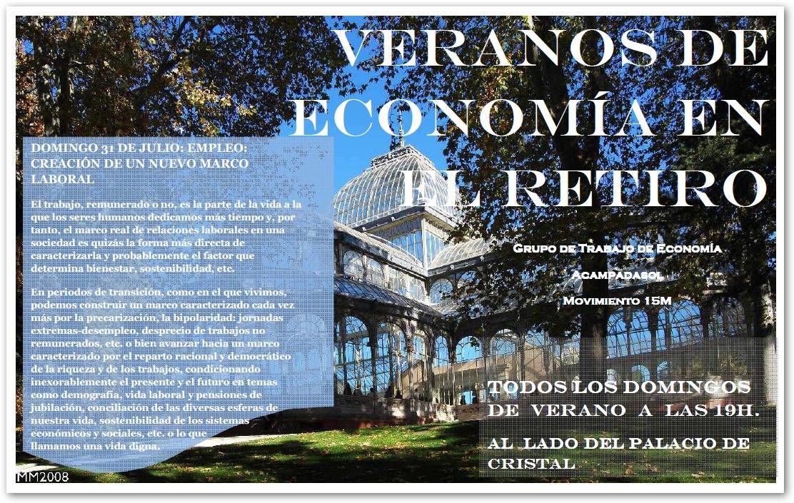 L. Torres.- El Grupo de Trabajo de Economía de la Puerta del Sol, perteneciente al movimiento del 15-M, ha convocado para este domingo 31 de julio, la primera de las asambleas de “Los veranos de Economía en el Retiro”, tal y como se adelantó en el I Foro Social de Economía celebrado el pasado lunes en el Palacio de Cristal.