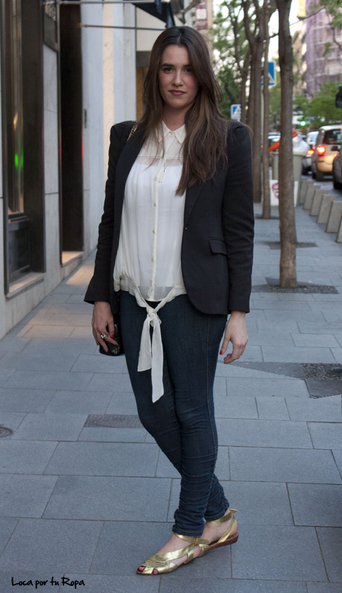 Estamos ya en mayo y hemos tenido la suerte de poder disfrutar de días calurosos que nos han permitido llevar sandalias. Además esta es una buena época para observar y elegir aquellas que queremos comprar para el verano. Es por eso que en cuanto vi a esta chica quise hacerle la foto para ir tomando nota. Me contó que las suyas de tiras doradas – que siguen siendo tendencia desde que aparecieron en el verano del 2009- se las compró en el mercado de CademTown en Londres y había decidido combinarlas con un look perfecto para ir a trabajar o tomar un café con amigas, ya que completa el outfit con unos vaqueros oscuros, una bonita camisa semitransparente romántica y una americana negra –siendo todas estas prendas de Zara-.