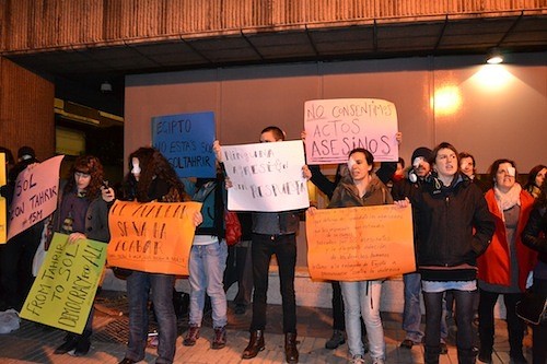 C. Linares.- Desde primera hora de este lunes la red social Twitter se llenó de llamamientos a la concentración que tuvo lugar por la tarde, entre las 18:00 y las 20:00 horas, frente a la embajada de Egipto, en el número 69 de la calle Velázquez. Los convocantes seguían el llamamiento de los activistas de la plaza Tahrir de El Cairo, símbolo de la indignación mundial y unas treinta personas acudieron a la cita.