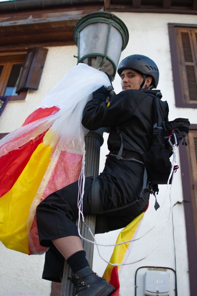 El paracaidista del ejército que portaba la bandera de España en el desfile militar del 12 de octubre de 2019 y chocó contra una farola cuando estaba a punto de aterrizar junto al estadio Santiago Bernabéu, donde está ubicado el palco de autoridades, se ha convertido sin quererlo en disfraz de los Carnavales de 2020.