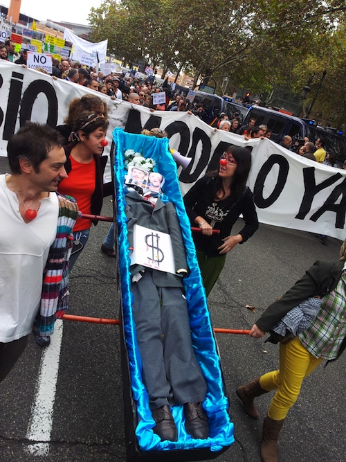 Presidiendo la pancarta iban varios jóvenes con nariz de payaso que cargaban un ataúd de cartón en cuyo interior había una figura cuyo rostro era una mezcla entre Rubalcaba y Rajoy y cuyo cuerpo simulaba el símbolo del dólar con sangre encima, que representaba “la muerte del sistema capitalista”, decían, porque el líder socialista y el popular “son lo mismo”.