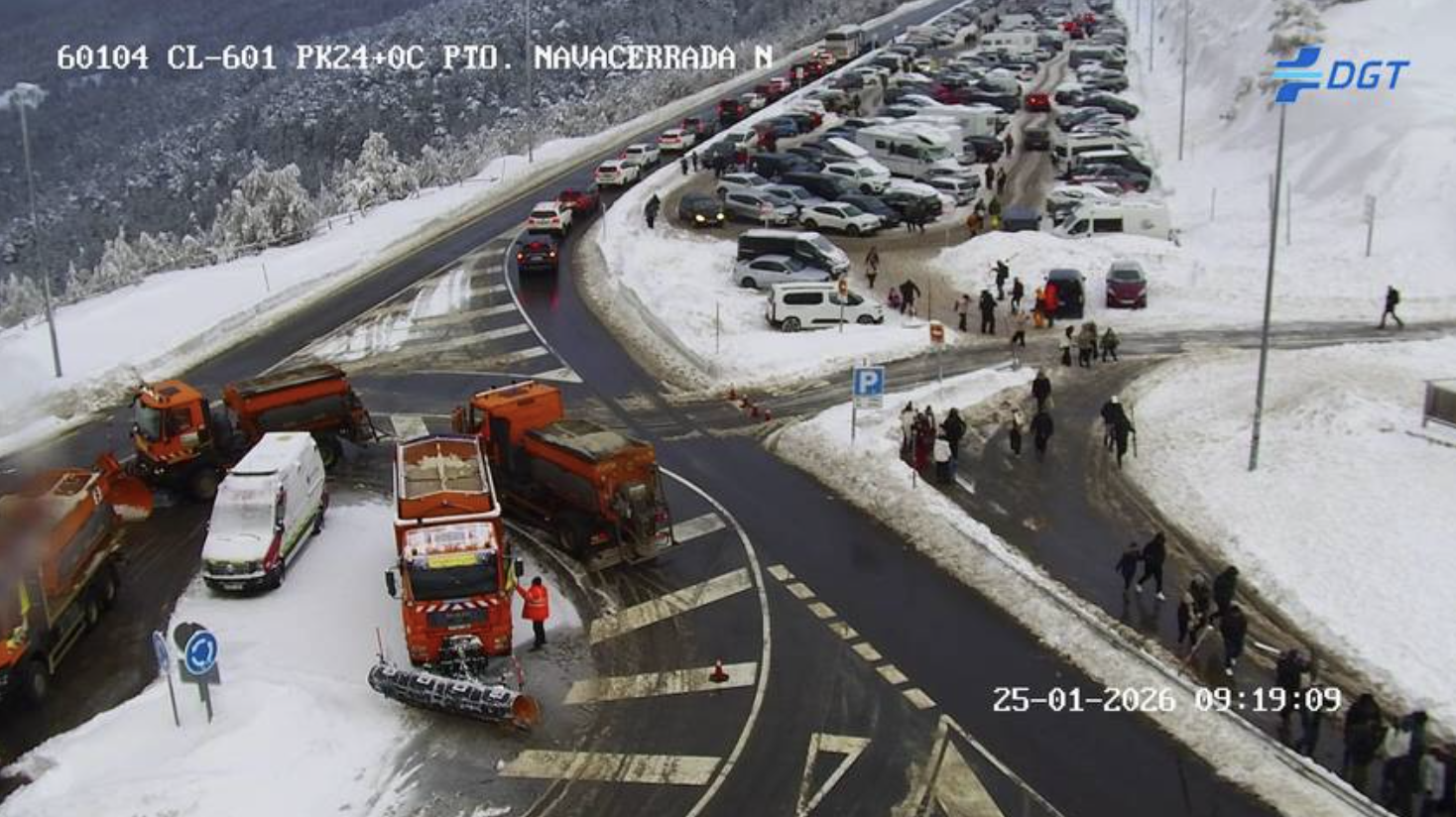 Como es habitual en las jornadas de ocio, los aparcamientos de zonas emblemáticas como Cotos y Navacerrada están al máximo y sus responsables recuerdan la necesidad de portar neumáticos de invierno o cadenas.