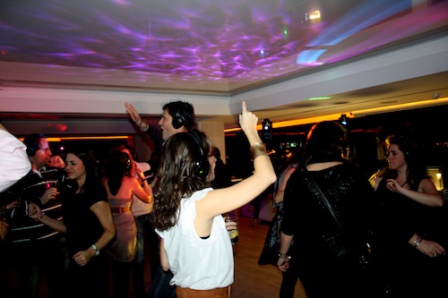 Una vez llegamos a la sala, una chica muy amable que estaba justo en la entrada nos explicó el funcionamiento de los cascos, que tienen 3 canales con 3 estilos de música diferentes: house, 80’s y rollito ibicenco. Ya estábamos listos. Y he de decir que nada más entrar a la fiesta me sentía rara de narices y hasta un poco incómoda. El panorama era el siguiente: una sala con iluminación de discoteca en la que se veía gente bailando con cierta rigidez -supongo que porque se sentirían igual de raros-, exceptuando un grupo de chicas que lo estaban dando absolutamente todo -lo cual era más extraño aún visto desde fuera-. Cuál fue mi sorpresa cuándo descubrí que a los platos estaba ¡el gran Fernandisco de nuevo! pinchando en el canal1 de House. Pedazo de sesión, por cierto. Temazos uno detrás de otro. Pero claro, no me sentía lo suficientemente suelta como para disfrutarlos a tope.