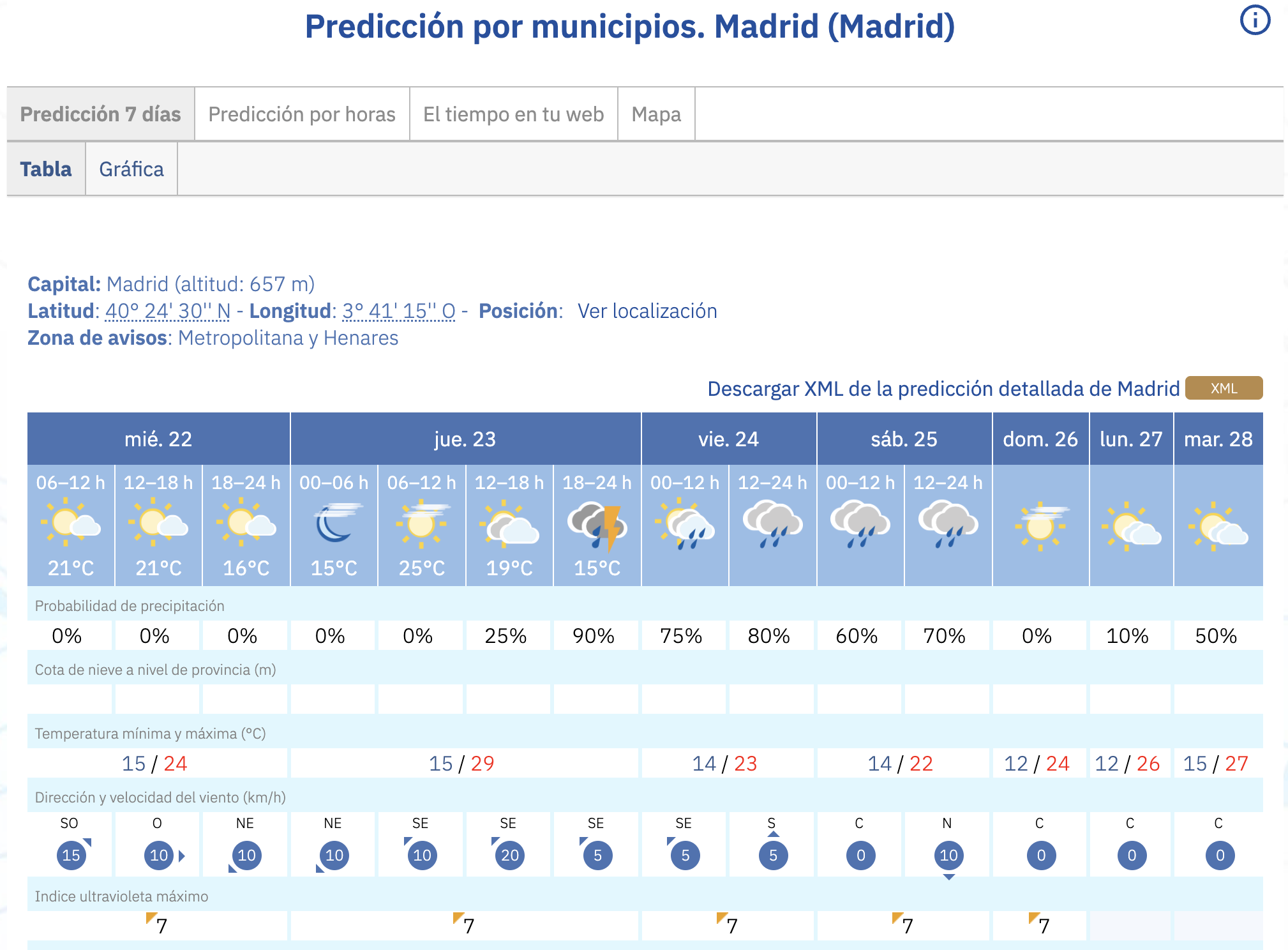 Para el miércoles 22 de abril, se espera que la inestabilidad remita ligeramente en la capital, aunque las temperaturas máximas sufrirán un ligero descenso, situándose en el entorno de los 24°C.