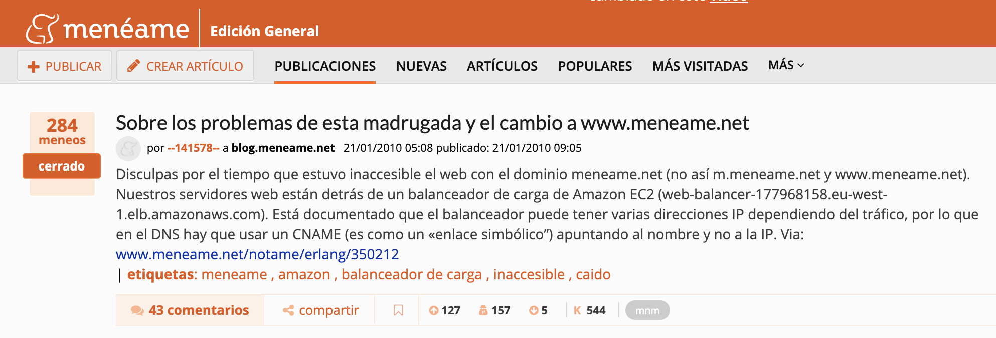 El 21 de enero de 2010 la web de menéame también estuvo caída. “Disculpas por el tiempo que estuvo inaccesible el web con el dominio meneame.net (no así m.meneame.net y www.meneame.net). Nuestros servidores web están detrás de un balanceador de carga de Amazon EC2 (web-balancer-177968158.eu-west-1.elb.amazonaws.com). Está documentado que el balanceador puede tener varias direcciones IP dependiendo del tráfico, por lo que en el DNS hay que usar un CNAME (es como un «enlace simbólico”) apuntando al nombre y no a la IP. Via: www.meneame.net/notame/erlang/350212”