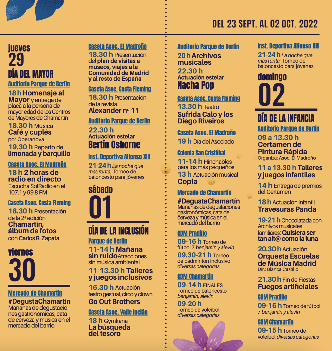 Este viernes 23 de septiembre de 2022 comienzan las fiestas de Chamartín en el Parque de Berlín (Metro Concha Espina). Tras dos años sin celebrarse por la pandemia, las fiestas de San Miguel vuelven hasta el 2 de octubre, destacando en su programación los conciertos de Bertín Osborne (viernes) y Nacha Pop (sábado) y el ‘tardeo’ de David Dcano y Borja Rodríguez (de las 18:30 a las 23:00 h del sábado 24).