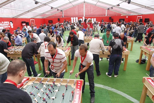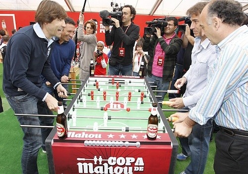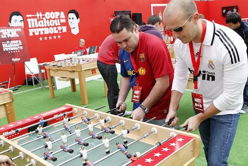 L. Torres.- Cientos de aficionados al fútbol se han pasado este sábado por el barrio para celebrar la I Copa Mahou de Futbolín, en la que han competido 96 parejas y han podido jugar más de 300 vecinos que, animados por la gran carpa-futbolín que había frente al Palacio de Deportes, visitaron el lugar entre las diez de la mañana y las ocho de la tarde. “Gracias a la campaña organizada en Facebook o informados por algunos de los principales diarios deportivos, se apuntaron parejas de Madrid, Granada, Tarragona… pero, fuera de competición jugador entre 300 y 400 personas que pasaron por la plaza y se animaron a echar unas partidas”, han comentado los organizadores a Zonaretiro.com