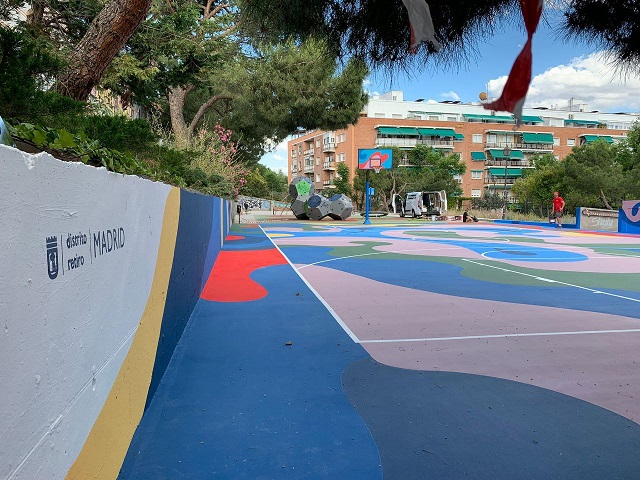 La plataforma digital ha elegido esta pista de baloncesto para esta actuación tras las mejoras realizadas por la Junta Municipal de Retiro con una inversión de más de 700.000 euros en este mandato en unas instalaciones que sirven de punto de encuentro para la realización de actividades por parte de entidades y asociaciones de barrio.