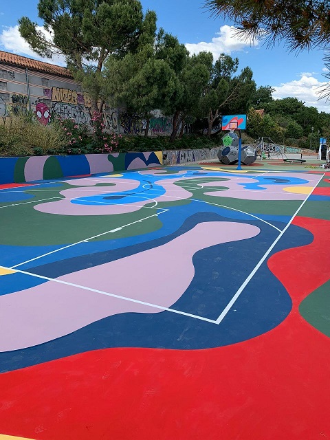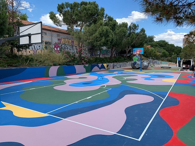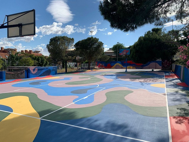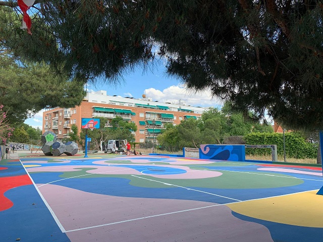 La plataforma digital ha elegido esta pista de baloncesto para esta actuación tras las mejoras realizadas por la Junta Municipal de Retiro con una inversión de más de 700.000 euros en este mandato en unas instalaciones que sirven de punto de encuentro para la realización de actividades por parte de entidades y asociaciones de barrio.