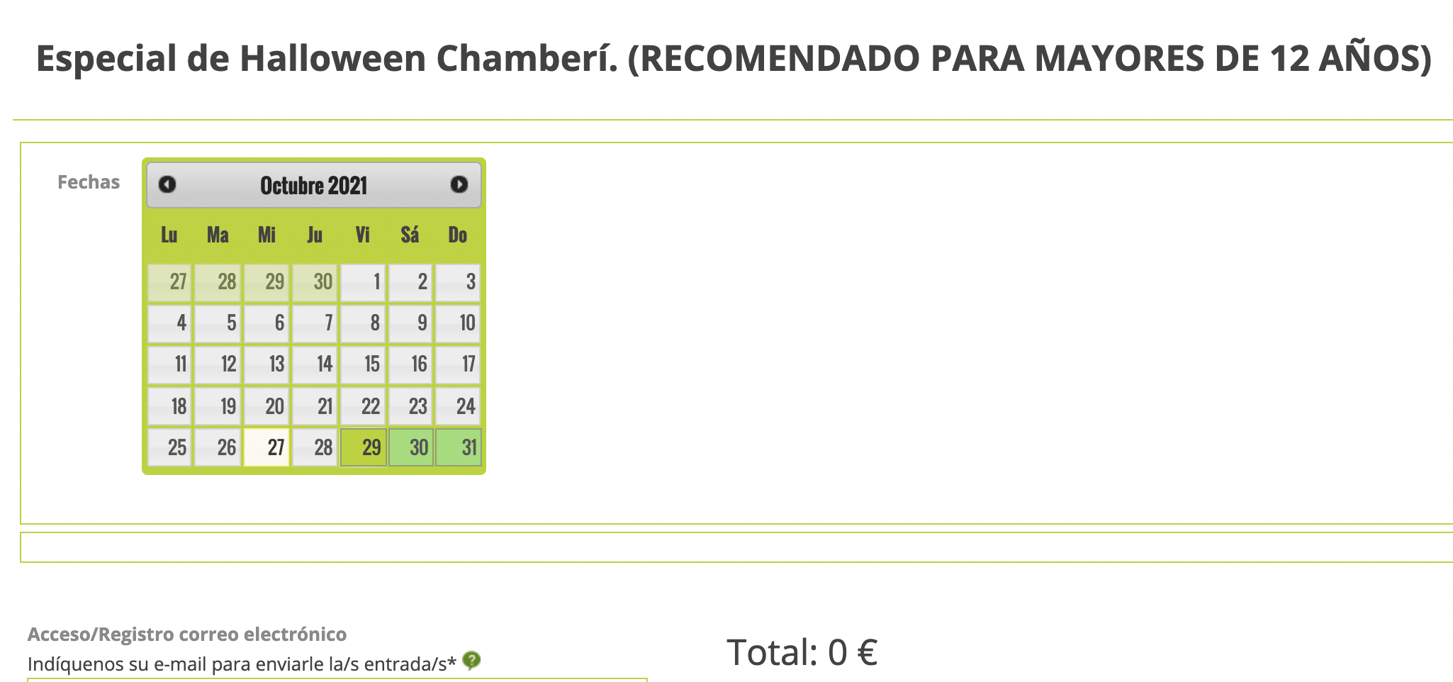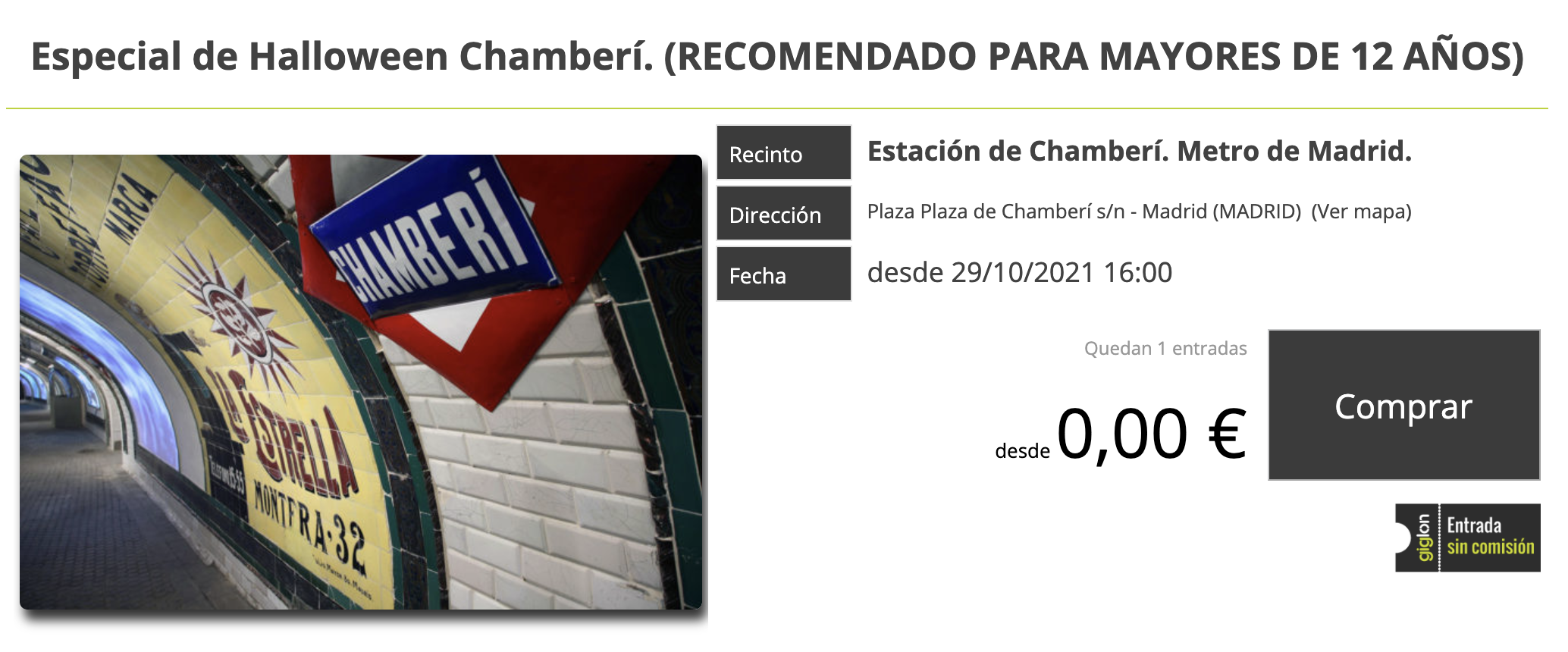 Los madrileños de más de 12 años de deseen pasar un Halloween terrorífico podrán visitar este viernes 29 de octubre de 2021 por la tarde o el sábado 30 y domingo 31 por la mañana o por la tarde la estación fantasma de Metro de Madrid (la antigua estación de Metro Chamberí que cerró en 1966), que se ambientará con estética de terror -esqueletos, brujas, calabazas, arañas, etc- y personajes de miedo -varios actores que interactuarán con los visitantes. Y se habilitará un espacio especial para hacerse fotografías de miedo.