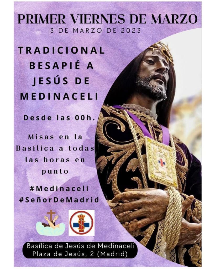 Hoy viernes 3 de marzo de 2023, como cada primer viernes del mes de marzo, desde que acabó la Guerra Civil y la figura del Cristo de Medinaceli regresó a la iglesia de la Plaza de Jesús, en el centro de Madrid, sus fieles y seguidores hacen cola frente a la Parroquia de Jesús de Medinaceli para el tradicional besapiés.