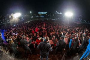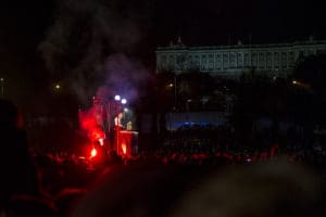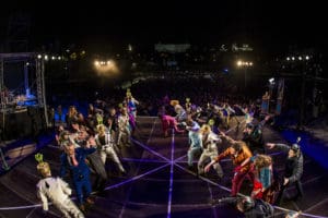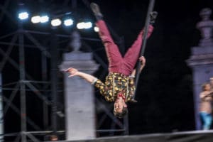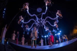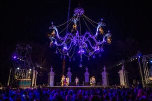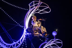 La explanada de Puente del Rey, frente al Campo del Moro, en Madrid Río acogerá este domingo 30 de diciembre de 2018 a las 20.00 horas un espectáculo musical aéreo cuyos músicos tocarán suspendidos de una lámpara gigante de 12 metros de altura y bailarines realizarán acrobacias.