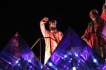 Tras ellos iban los Suaveciclos, dos triciclos que proyectaban a su paso sobre las fachadas, los árboles y el propio público imágenes y animaciones en torno al viaje de los Reyes Magos desde Oriente hasta Madrid.
