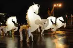 Cuando todas las carrozas procedentes del Parque del Retiro rodearon la fuente de Cibeles, tuvo lugar un espectáculo piro-musical, en el que el grupo Sinfonity aporto sonido de guitarras al lanzamiento de los cohetes.