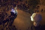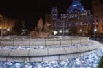 Durante esta noche, las fuentes de Cibeles, Apolo y Neptuno se llenarán con 60.000 botellas de plástico recicladas e iluminadas para denunciar el uso masivo del plástico en la sociedad actual; en la explanada del Palacio de Cibeles, una gran cabeza de siete metros de alto pondrá el acento en el la importancia que se le da a la imagen de uno mismo en la actualidad.