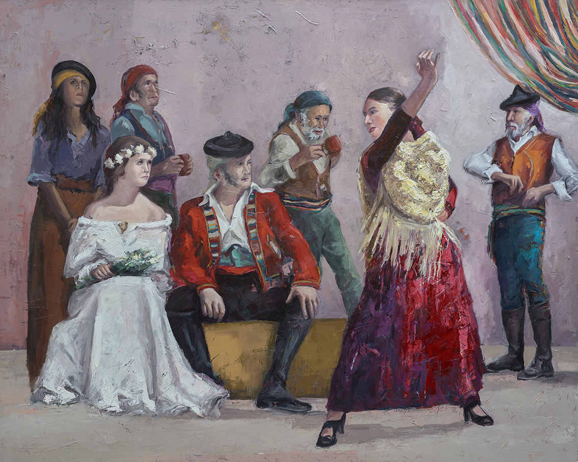 Un total de 51 obras de gran formato, pertenecientes a distintas etapas de su trayectoria artística que, desde el realismo hasta el arte abstracto, retratan paisajes y personajes como José María el Tempranillo, Luis Candelas y Diego Corrientes. Escenas de tragedia en las que colores vivos contrastan con cielos plomizos y cuyas composiciones, exhaustivamente documentadas, han sido objeto de un meticuloso estudio histórico y etnográfico.