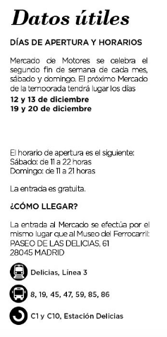 El Mercado de Motores regresa por partida doble al Museo del Ferrocarril de Madrid con motivo de la Navidad, con una edición el fin de semana del 12 y 13 de diciembre y otra el 19 y 20 de diciembre de 2020.