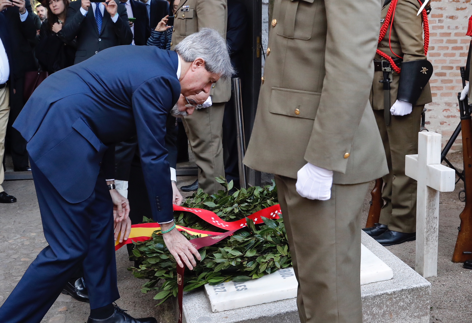 C. Linares.- El presidente en funciones de la Comunidad de Madrid, Ángel Garrido, ha presidido este miércoles, en lugar de Cifuentes, que hace unos días dimitió tras ser pillada robando en un super, la tradicional ofrenda floral a los Héroes del 2 de mayo de 1808 en el Cementerio de la Florida, junto al presidente de la Sociedad Filantrópica de Milicianos Nacionales Veteranos, José Luis Sampedro.