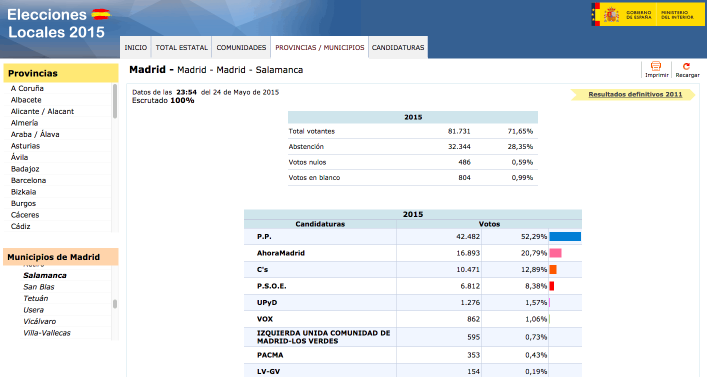 S. R.- A diferencia del distrito de Retiro, donde el 43,51% de sus habitantes votaron este domingo al PP y el 28,32% a Ahora Madrid para la alcaldía de la capital, en el distrito de Salamanca ha sido mayor el porcentaje de apoyos a Esperanza Aguirre que el de Manuela Carmena, como consta en la página web del Ministerio del Interior que ha consultado Zonaretiro.com.