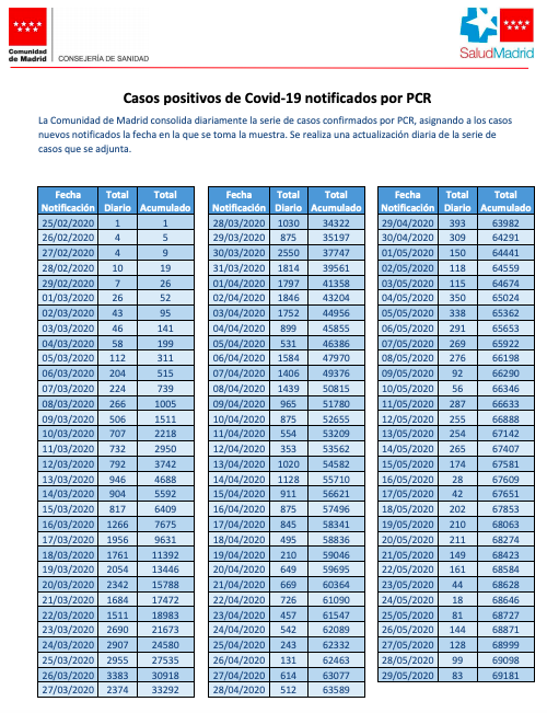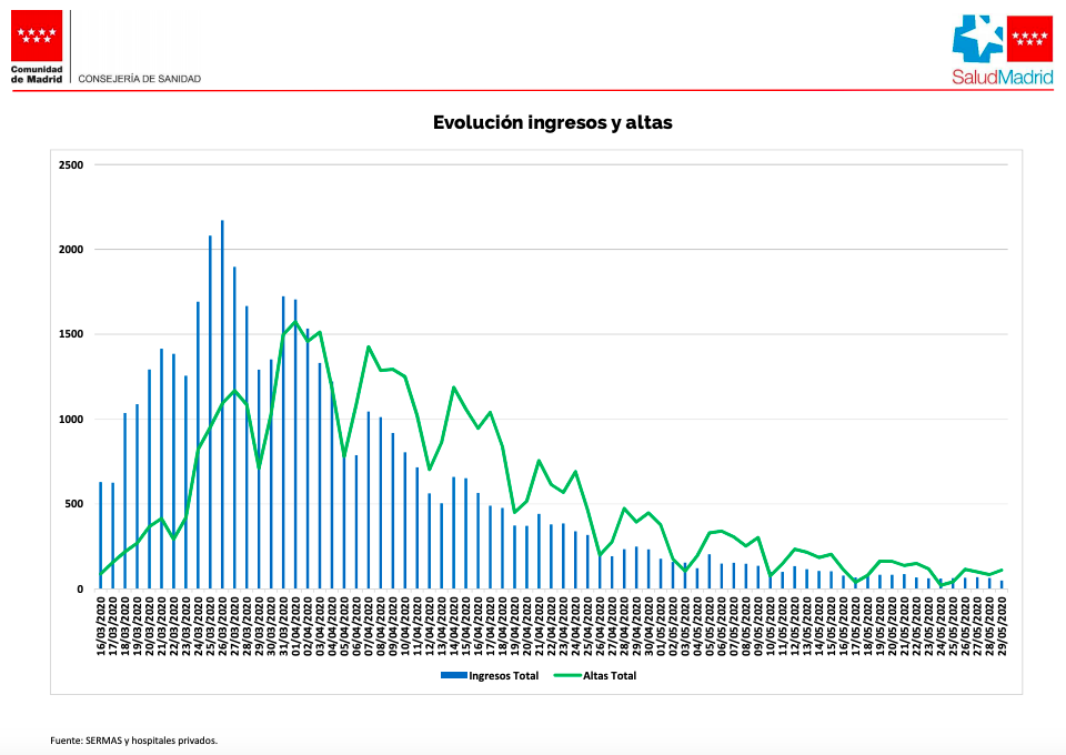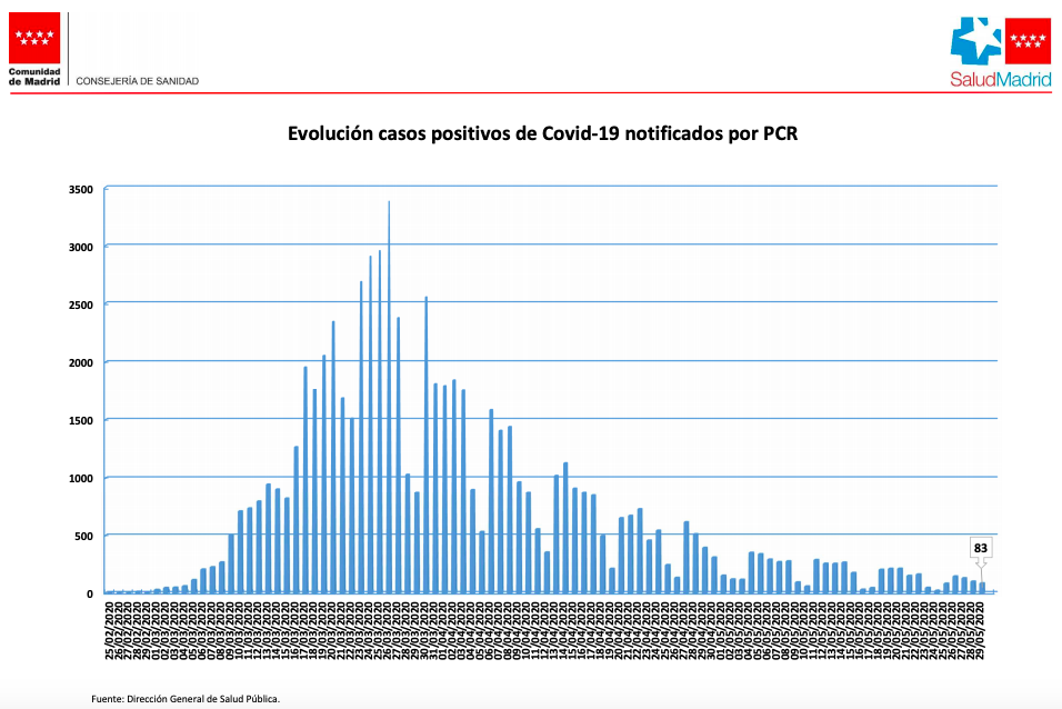 La Comunidad de Madrid ha registrado este sábado 30 de mayo de 2020 un repunte de nuevos infectados de Coronavirus con 83 contagios diarios, lo que supone 26 más respecto a la víspera, y los fallecidos diarios han subido a 8 (la víspera fueron 7).