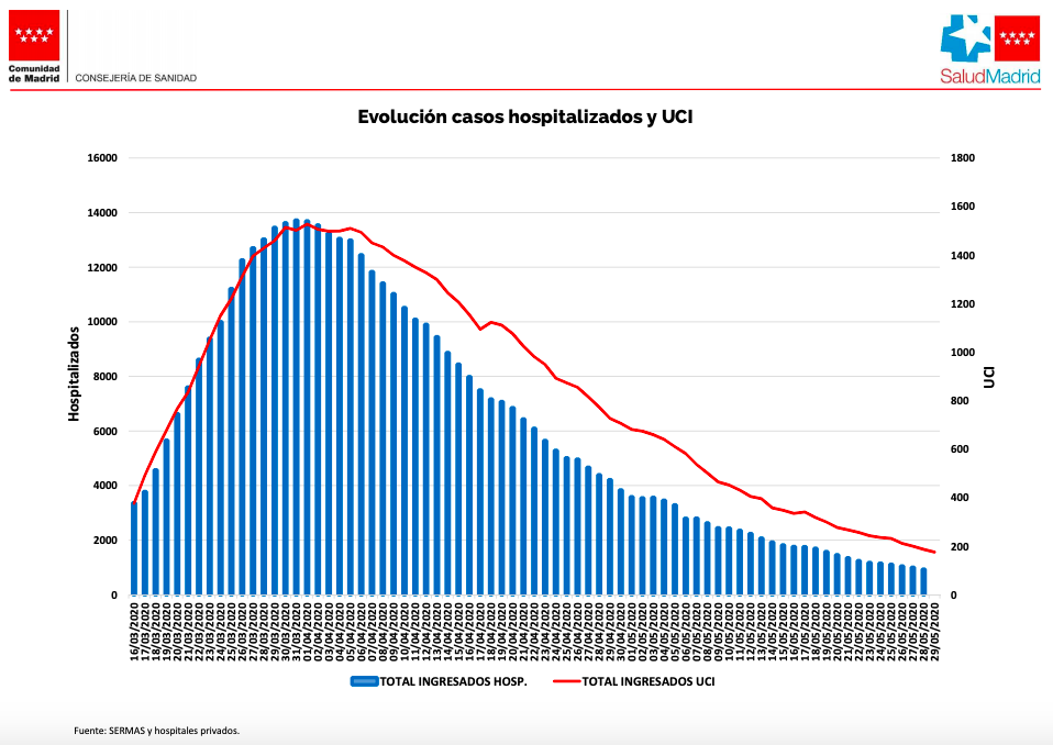 Por otro lado, Madrid registra solo cinco nuevos pacientes con síntomas agudos de la enfermedad respecto a ayer y la cifra de personas con coronavirus en UCI se sitúa en 3.657 desde el inicio de la crisis.