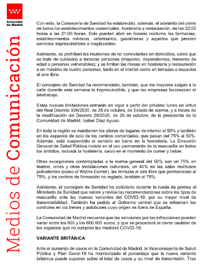 A partir el lunes 25 de enero de 2021, el toque de queda en la Comunidad de Madrid será a las 22.00 horas. Además. la hostelería deberá cerrar a las 21.00 horas. Por otro lado, se prohíben las reuniones en casas de personas que no sean convivientes y las reuniones fuera de casa -en bares y restaurantes- se limitan a 4 personas (en bares y restaurantes sí se permiten las reuniones de no convivientes).