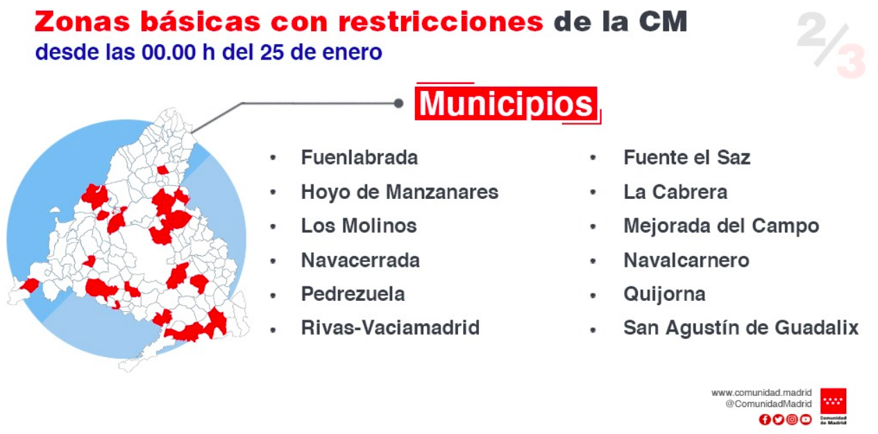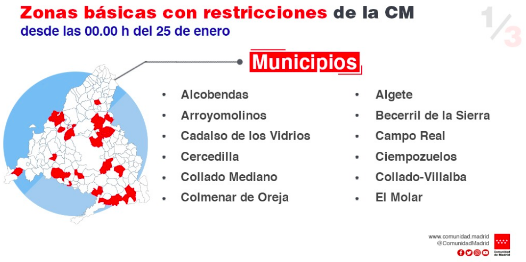A partir el lunes 25 de enero de 2021, el toque de queda en la Comunidad de Madrid será a las 22.00 horas. Además. la hostelería deberá cerrar a las 21.00 horas. Por otro lado, se prohíben las reuniones en casas de personas que no sean convivientes y las reuniones fuera de casa -en bares y restaurantes- se limitan a 4 personas (en bares y restaurantes sí se permiten las reuniones de no convivientes).