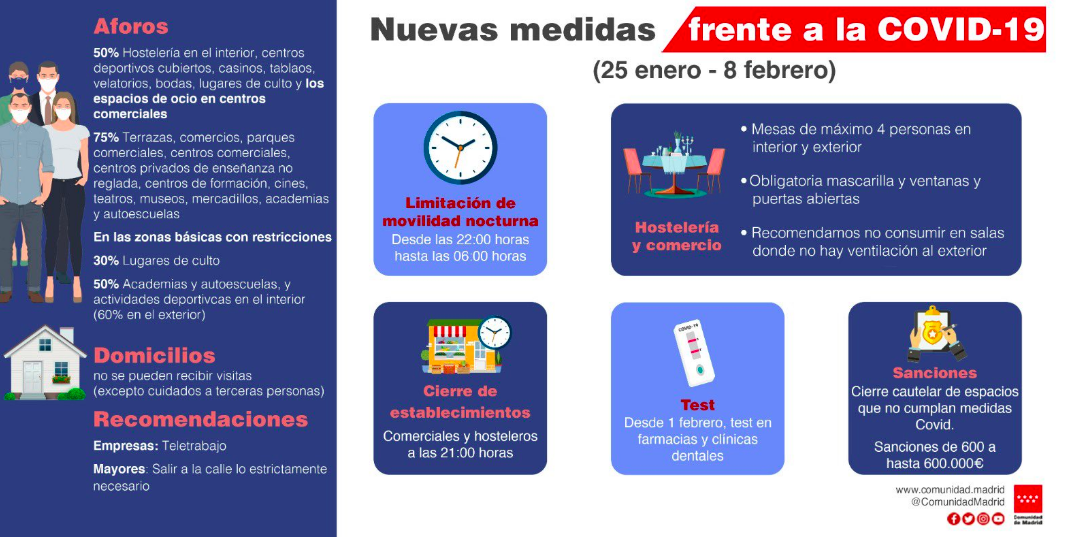 A partir el lunes 25 de enero de 2021, el toque de queda en la Comunidad de Madrid será a las 22.00 horas. Además. la hostelería deberá cerrar a las 21.00 horas. Por otro lado, se prohíben las reuniones en casas de personas que no sean convivientes y las reuniones fuera de casa -en bares y restaurantes- se limitan a 4 personas (en bares y restaurantes sí se permiten las reuniones de no convivientes).