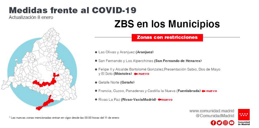 La Comunidad de Madrid amplía las restricciones de movilidad a 23 zonas básicas de salud y nueve localidades más. En total, a partir del próximo lunes, 11 de enero, 41 zonas básicas de salud (ZBS) y 14 localidades de la región tendrán prohibida la entrada y la salida, salvo por causas justificadas. En estas zonas viven algo más de 1,2 millones de madrileños, el 18,3% de la población, y en ellas se concentra el 25% de los casos de contagios por COVID-19 de la región.