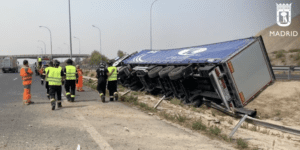 Los bomberos de la Comunidad de Madrid han controlado el derrame del combustible del camión y han asegurado los elementos dañados en el accidente.