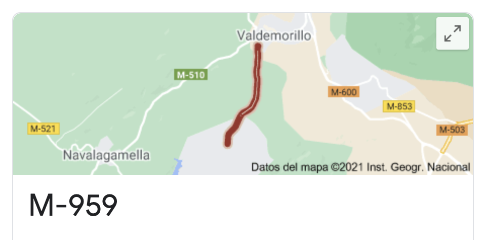 La carretera M-959 comunica Valdemorillo con la urbanización Cerro Alarcón, en paralelo al arroyo de la Nava.