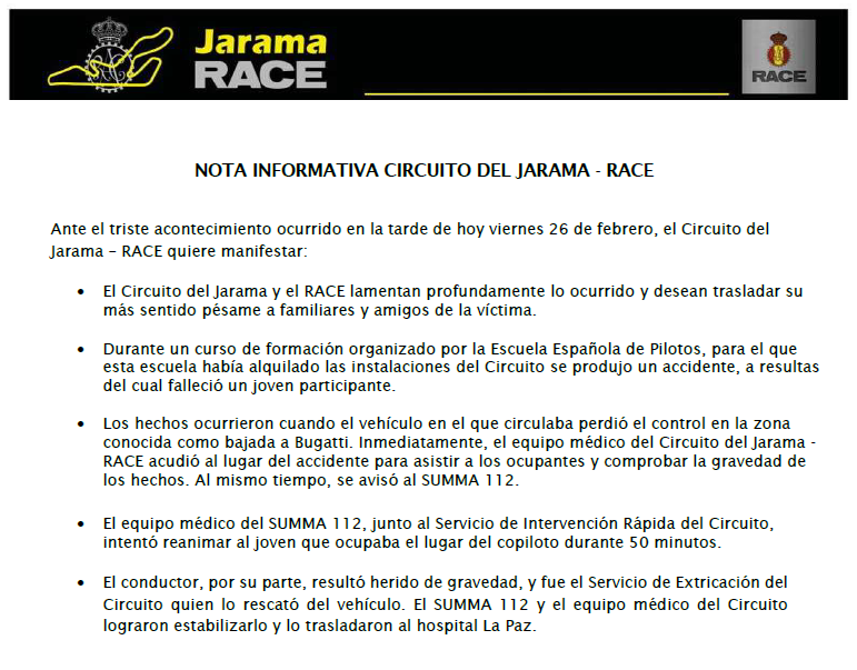 Las dos víctimas participaban en un curso de una escuela de formación que había alquilado la pista al @Circuito_Jarama.