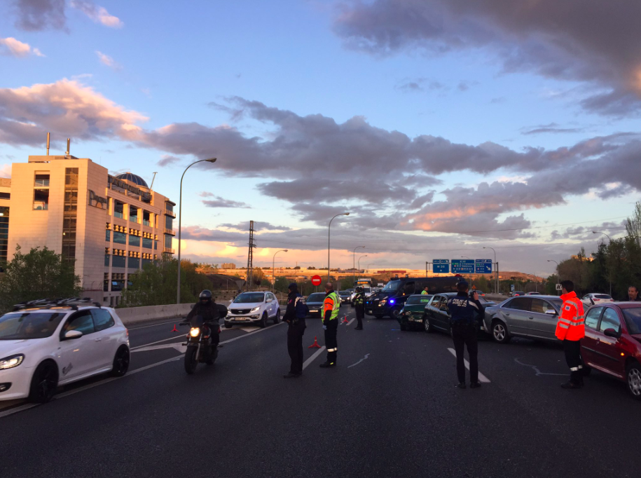 La Policía Municipal de Madrid está siendo la encargada de regular el tráfico, que a esta hora se encuentra denso y se están produciendo retenciones; mientras que la Guardia Civil ha realizado el atestado del incidente.