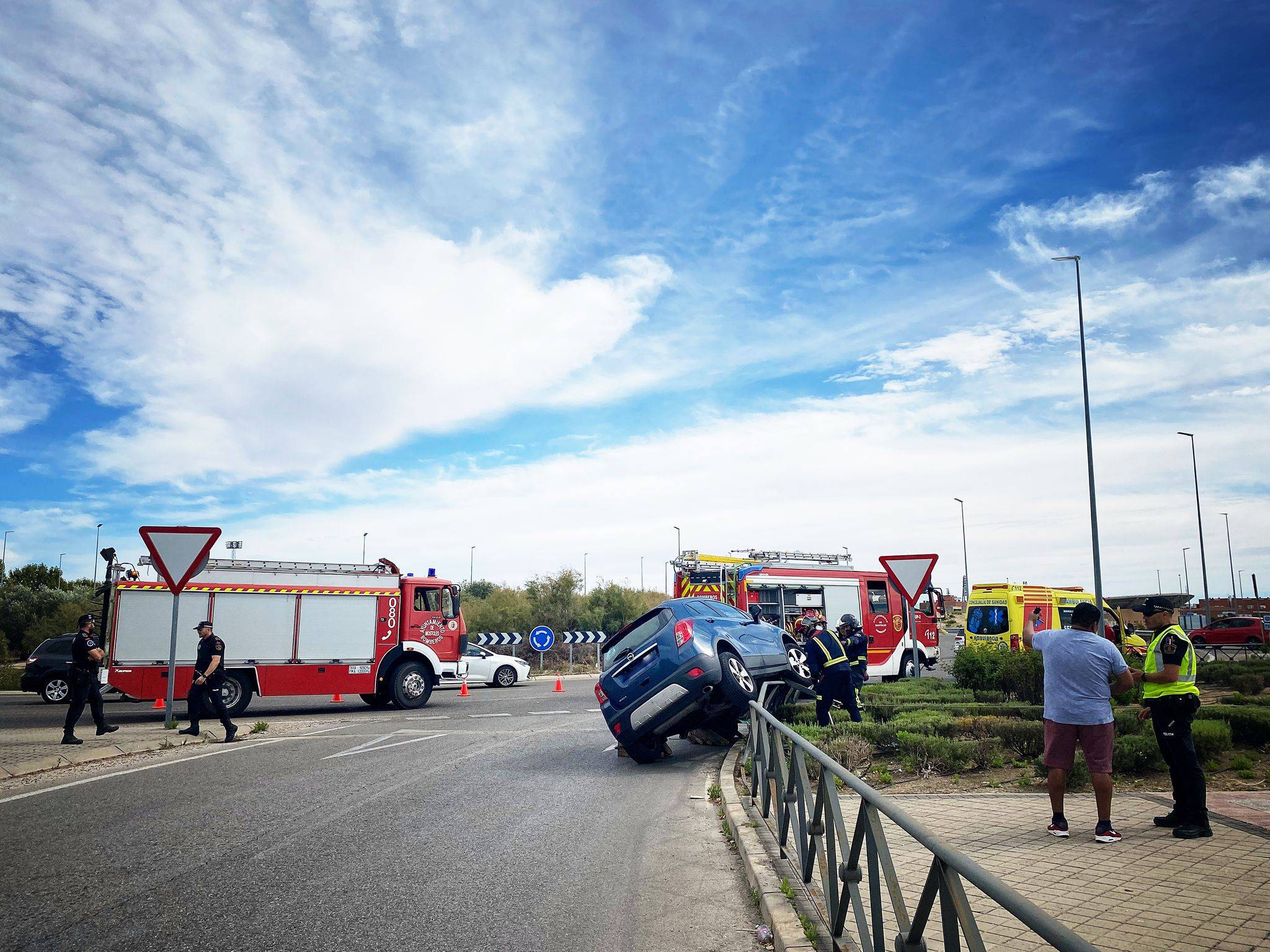 Hoy miércoles 28 de septiembre de 2022 un conductor se ha despistado y ha acabado circulando con sus ruedas derechas sobre la barandilla que rodea una rotonda en Móstoles.