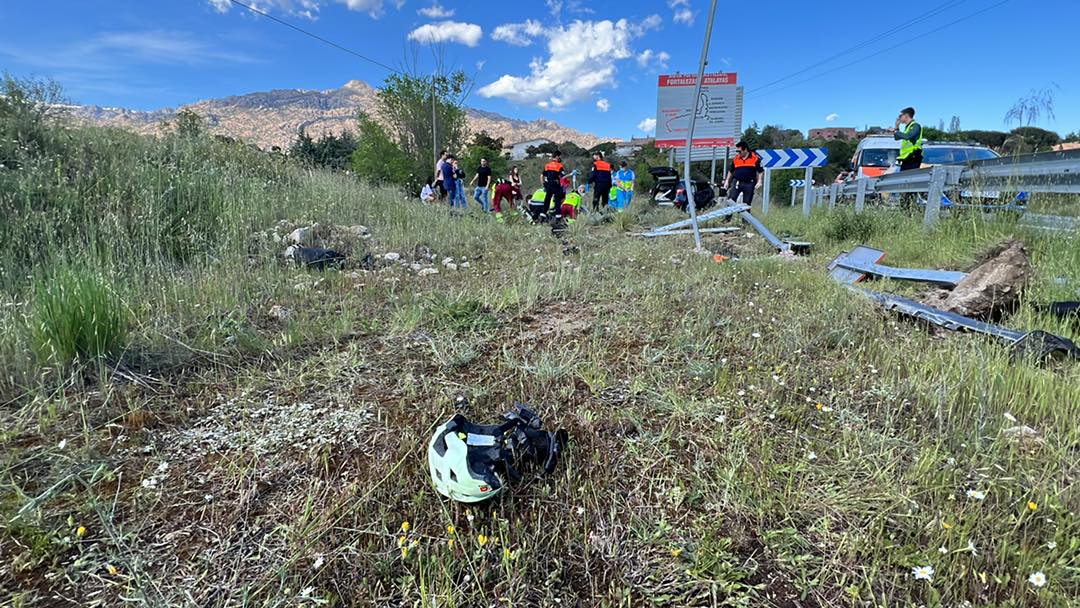 Como se ve en las fotos, el coche se ha salido varios metros de la carretera y ha acabado impactando contra el cartel indicativo de la ruta de los castillos que informa de la cercanía del castillo de Manzanares El Real.