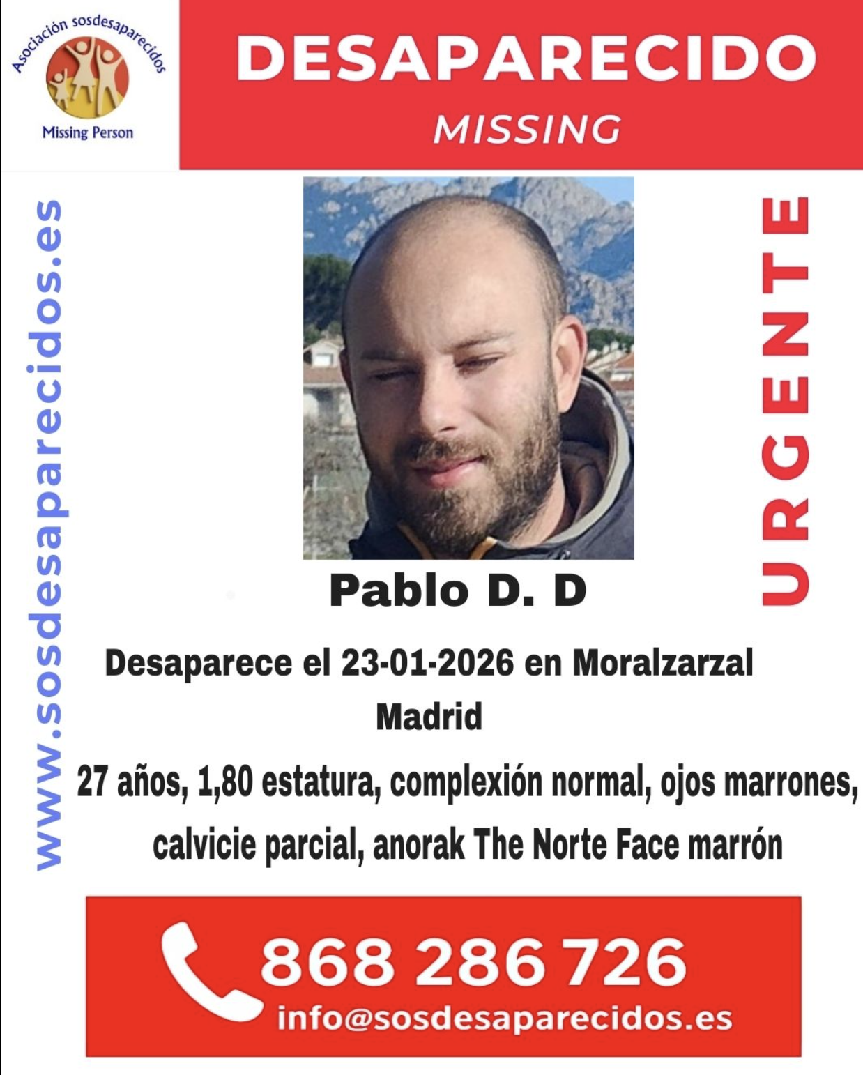 La Asociación SOS Desaparecidos ha lanzado una alerta urgente tras la desaparición de Pablo D. D., un joven de 27 años al que se le perdió la pista el pasado 23 de enero de 2026 en la localidad de Moralzarzal, Madrid. La organización ha calificado el aviso como “urgente” para agilizar la colaboración ciudadana en su localización.