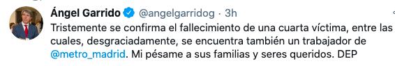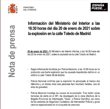 Este miércoles 20 de enero de 2021 a las 14.56 horas una explosión de gas ha dado paso al derrumbe de un edificio ubicado en la calle Toledo 98 -del que sólo queda en pie la estructura-, provocando al menos cuatro muertos: dos viandantes -uno de ellos de 85 años-, un sacerdote de 36 años y un electricista de 35 años, que era empleado de Metro de Madrid.