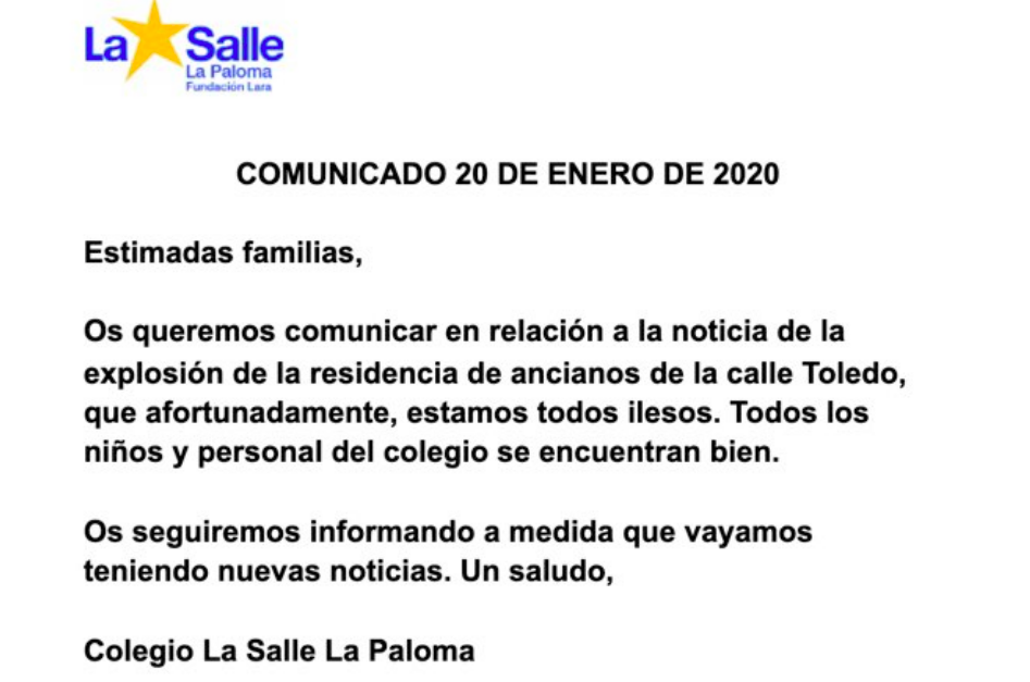 El edificio se ha venido abajo sobre el patio del colegio La Salle La Paloma en el que no había niños. El centro educativo confirma que todos los profesores y escolares que se encontraban en el interior del centro escolar están a salvo.