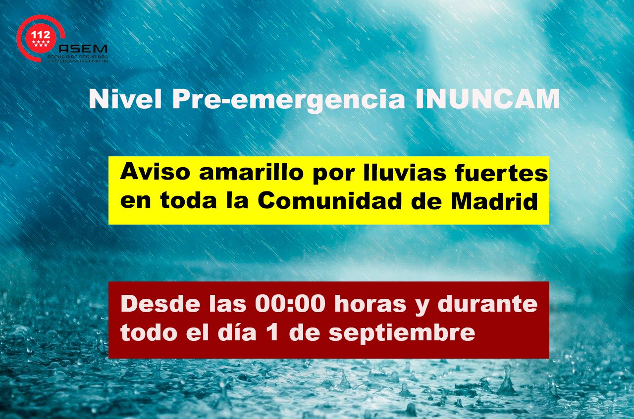 Activado en fase de Pre-emergencia el Plan Especial de Protección Civil ante el Riesgo de Inundaciones #INUNCAM ante la previsión de @AEMET_Madrid de lluvias fuertes a partir de esta noche. #Madrid112 avisa a ayuntamientos y servicios implicados. #ASEM112 pic.twitter.com/XgcquxEQ2V