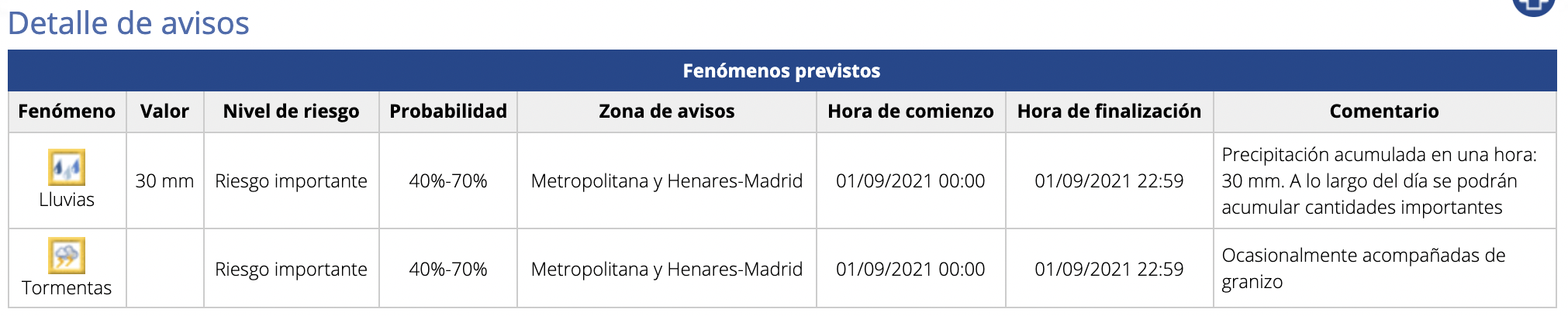 La Comunidad de Madrid informa hoy martes 31 de agosto de 2021 a las 12.00 horas de la activación del en fase de Pre-emergencia del Plan Especial de Protección Civil ante el Riesgo de Inundaciones a partir de esta noche del martes al miércoles.