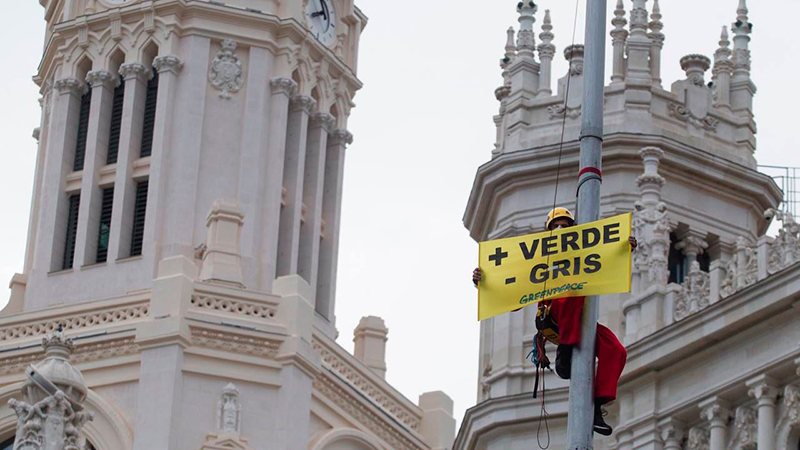 A través de esta acción realizada frente al Ayuntamiento de Madrid, reclamaban que Madrid sea una ciudad verde en un planeta sano, como reza la pancarta que han colocado ayudados por una grúa.
