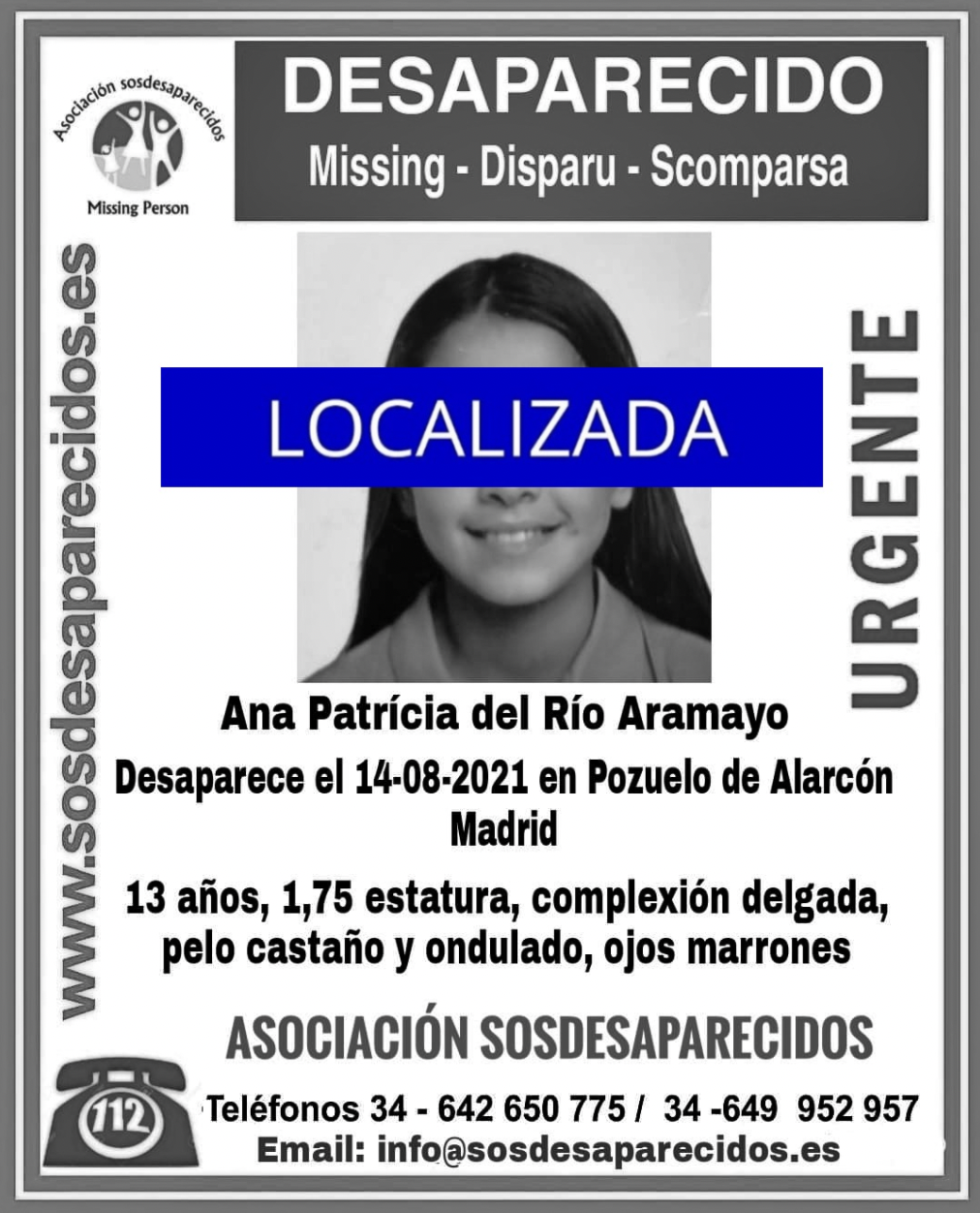 Este jueves 19 de agosto de 2021 por la mañana se ha comunicado la aparición de la niña de 13 años de Pozuelo que llevaba desaparecida desde el día 14.