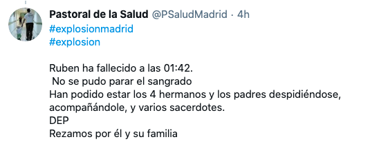 Esta noche ha muerto el joven sacerdote Rubén Pérez Ayala, al que ordené hace apenas siete meses. Agradezco su vida de entrega a Cristo y a su Iglesia. Rezo por su familia. Pido también por los otros fallecidos tras la explosión en La Paloma y por todos los afectados.