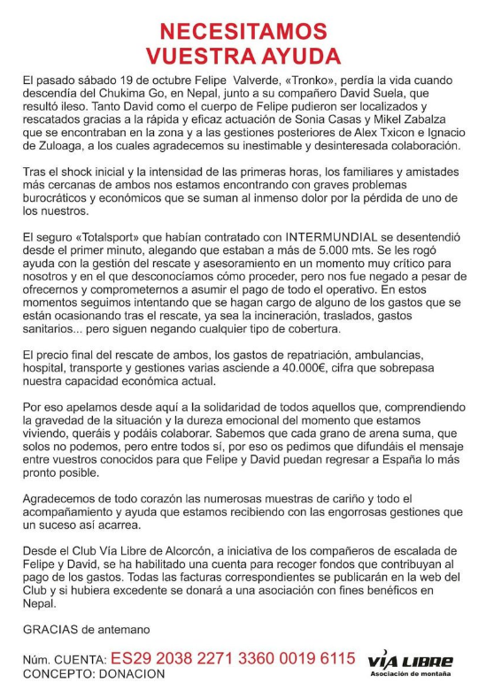 El montañero madrileño Felipe Valverde Tronko falleció el sábado 19 de octubre de 2019 cuando intentaba hacer cumbre en el pico Chukima Go, a 6.258 metros de altitud, en Nepal.