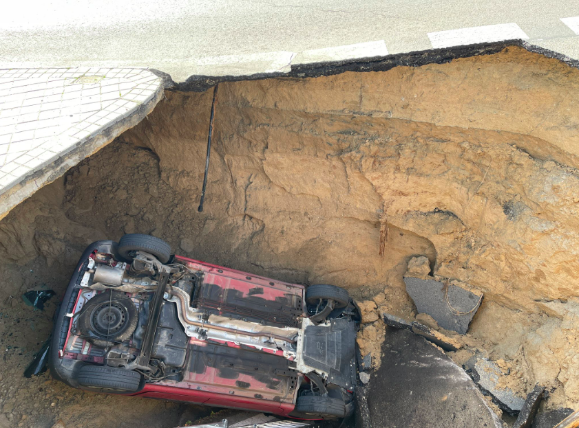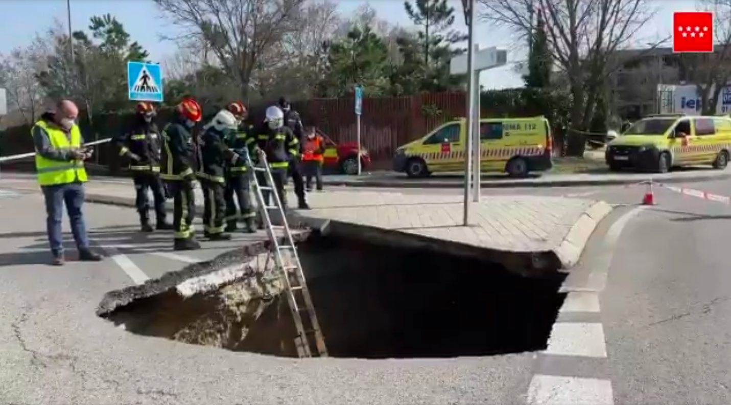 Este viernes 5 de febrero de 2021 a las 12.45 horas un conductor ha caído con su coche a un socavón de entre 3 y 4 metros de profundidad abierto en la carretera a causa de unas filtraciones de agua, en el acceso a la rotonda de Renfe de Majadahonda.