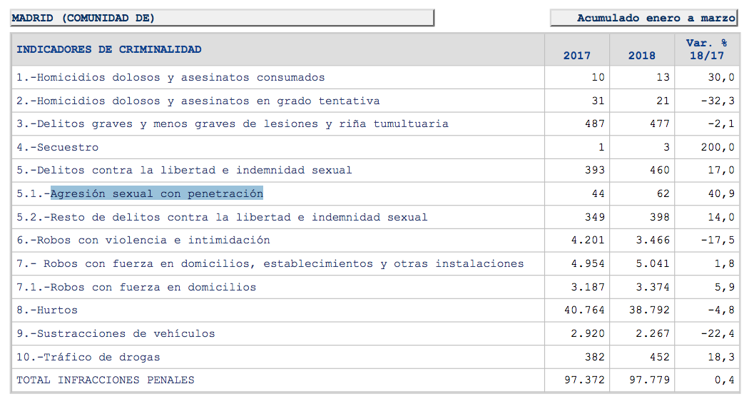 En Madrid ciudad las agresiones sexuales con penetración han subido en un 77,8% pasando de 27 a 48 de enero a marzo de 2018.
