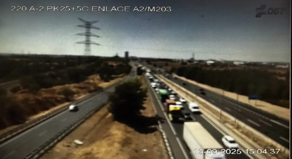 Este martes 16 de septiembre de 2025 a las 15.00 horas el tráfico permanece parado a la altura del kilómetro 28 de la A-2 debido a un accidente en el que se han visto implicados varios camiones.